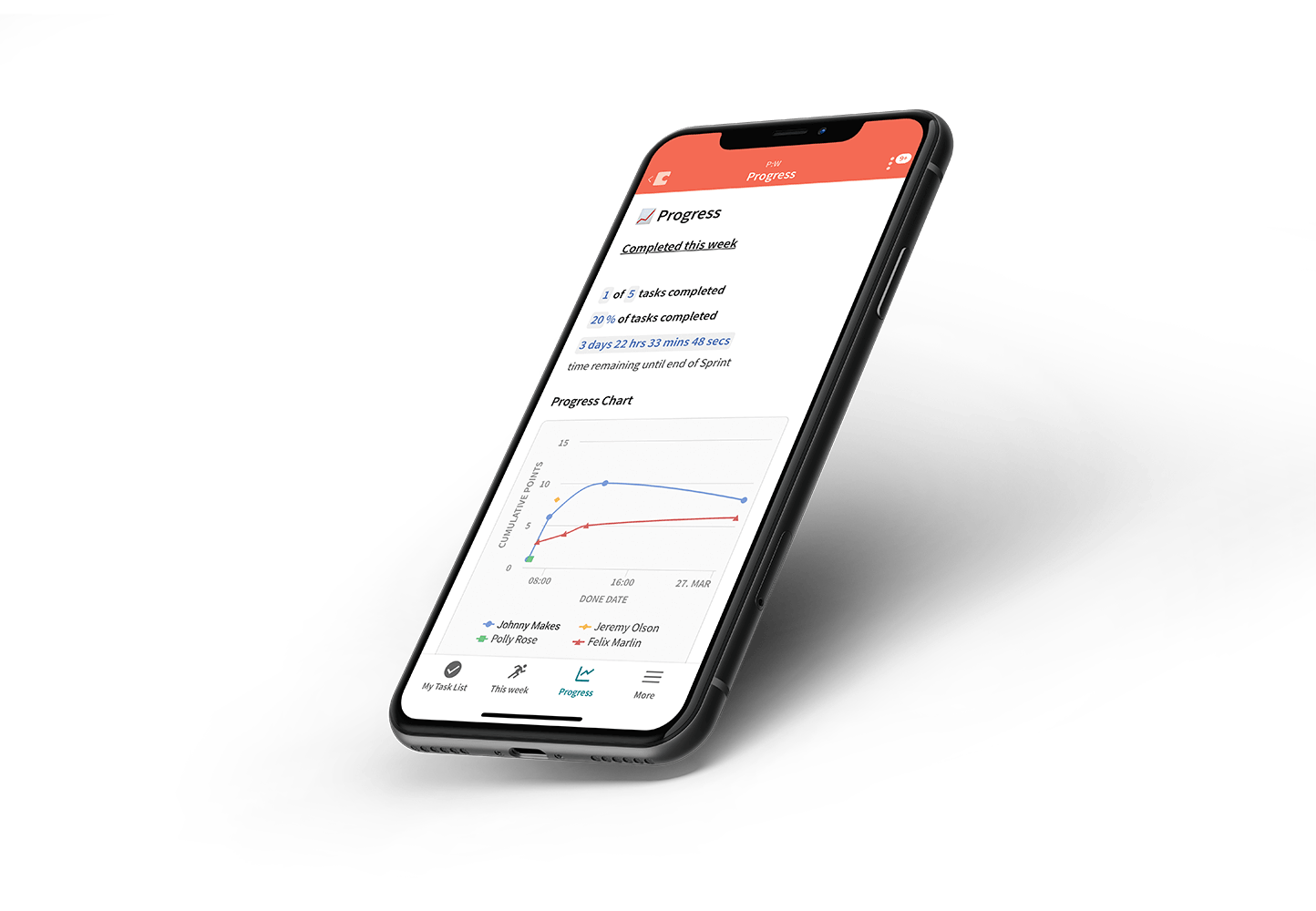 Throughout each week, all team progress is visible in the 'Progress' dashboard for mild competition/motivation, as well as individual stats on tasks done etc.