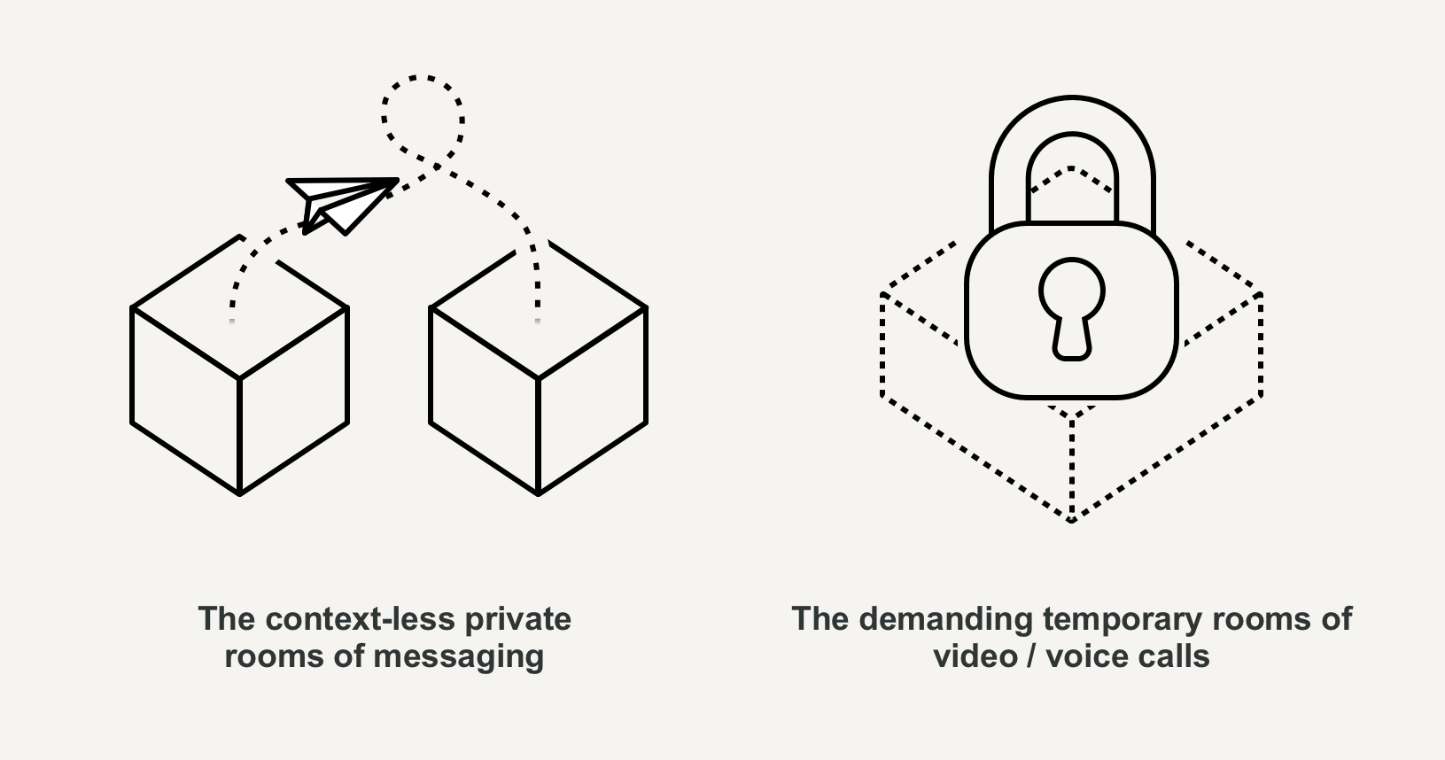 However, neither of these reflect the casual nature of a conversation in an office, a coworking space, or even just hanging out. In those, people are present in a space together and are ‘open’ to conversation i.e. there is a continuous ‘session' going on, even if people don’t have to actively be engaged in it. (Note: Arguably, a more awkward version of this also happens on a conference call whilst waiting for others to join, but is short-lived and more incidental.)